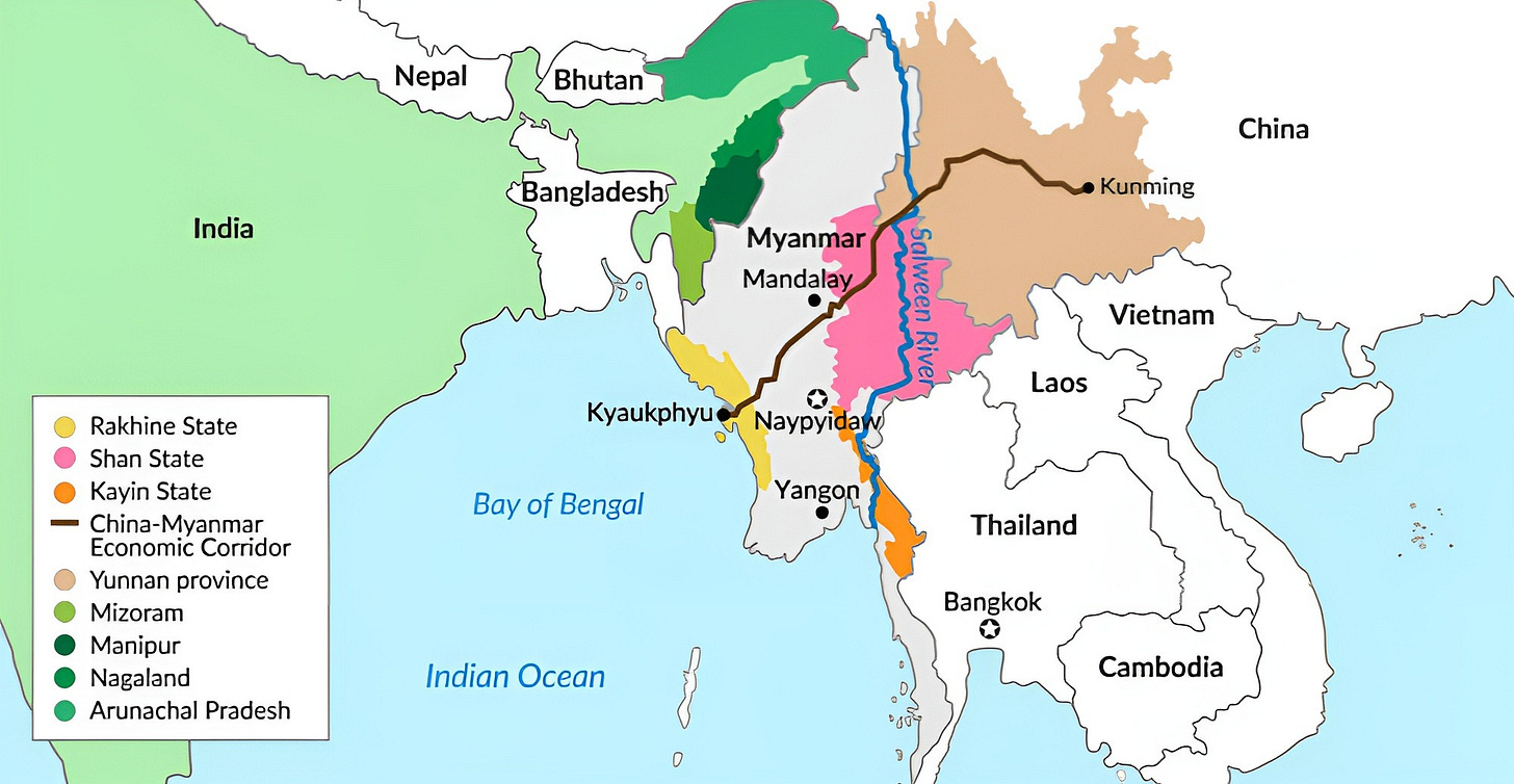 At the same time, India is strengthening its ties with Myanmar through its Act East policy. Key projects include the India-Myanmar-Thailand trilateral highway and the Kaladan multimodal corridor, which aims to connect India’s northeastern states to Rakhine by sea, river, and road. Both initiatives aim to reduce India’s strategic isolation and expand its economic presence in Southeast Asia.